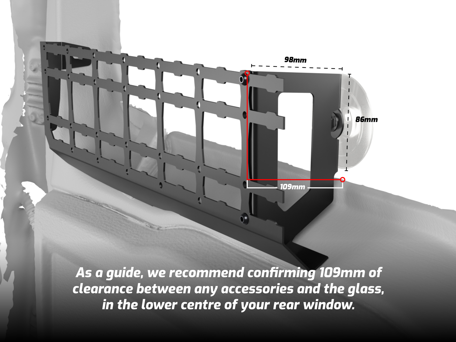 We recommend ensuring 109mm clearance between any accessories and the glass, in the lower centre of your rear window.